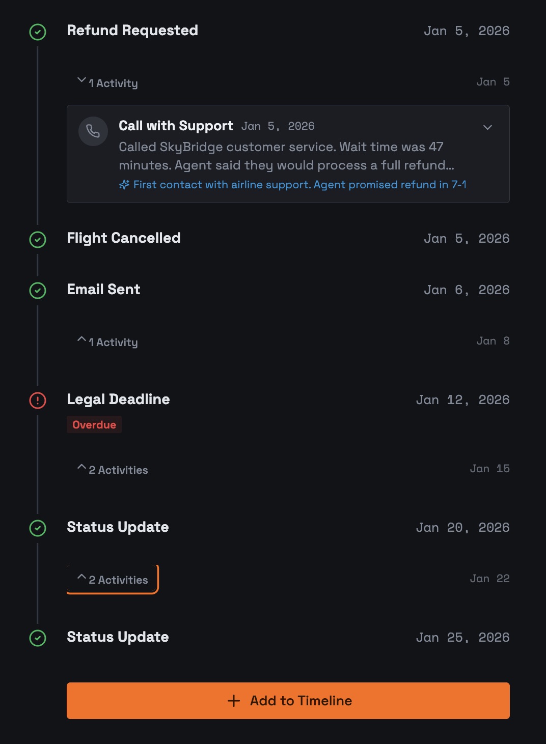 Your flight details, legal deadlines, documents, and timeline. Organized and ready. No more digging through emails. No more forgetting what the airline promised.