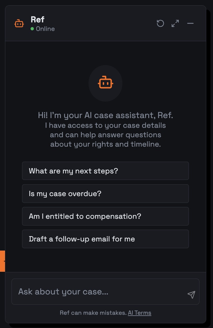 Not sure what to do next? Your AI case assistant knows your entire history. Ask it to draft a follow-up email, prep you for a phone call, or explain your rights in plain English.